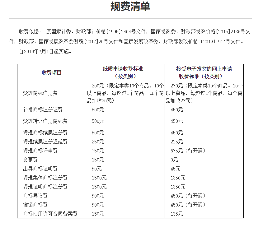 商标规费一览表